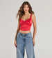The glam vibes of this satin crop top are unreal! With a peekaboo bandeau trim and a fitted silhouette. this top is perfect for a night out. Pair with jeans.