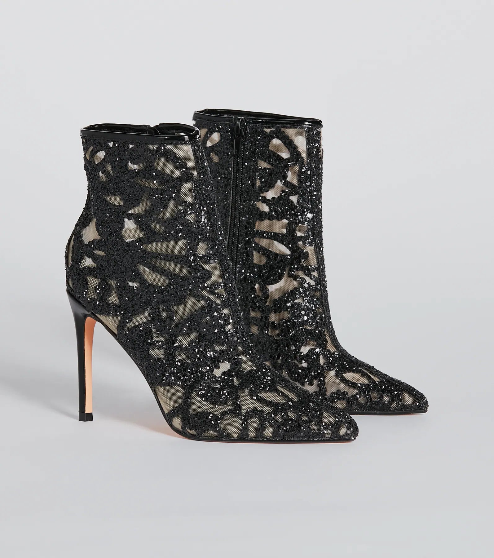 A pair of chic booties that radiate glamorous energy - who doesn't want that? These booties feature a pointed toe. inner zipper closure. a sleek stiletto heel. and an eye-catching glitter lace-like pattern on sheer mesh material. Complete the look in a sleek trench coat for a dinner and cocktail downtown!