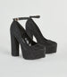 Show up and stun like the glamour queen you are in these glitzy and bold rhinestone platform pumps! They feature a closed almond toe. a thin adjustable ankle strap. a closed back. a chunky platform sole. an ultra-tall block heel. and all-over mini rhinestone embellishments. Style with a glitter mesh clutch to turn heads on your next night out.