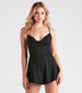 Make your eyes sparkle and everyone else's in this glitter knit romper! It features a sleeveless cowl neckline. spaghetti straps that crisscross along the open back. a fitted high waist seam. and a short flowy hem. The glitter knit fabric offers a moderate stretch. Complete the look in radiant rhinestone jewelry for a girl's night out!