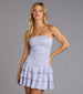 All sparkle. all attitude—this strapless ruffle mini dress is the definition of party-perfect. The glitter knit and tiered ruffle design keep it flirty. fun. and ready for every glam night out.