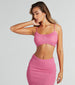 Bring on the glittery vibes for your next girl's night in this ruched crop top! Designed with a glitzy glitter knit fabric. this crop top is glam perfection. It features a sleeveless scoop neckline with ruching for an alluring detail. built-in padded cups so you don't need to wear a bra. spaghetti straps. and an ultra-cropped hem with a form-hugging fit for a sultry slay. Complete your going-out look with the matching maxi skirt and clear heels!