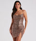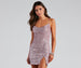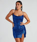 Bring the glam energy with this glitzy sequin embroidered mini dress! It features a sleeveless cowl neckline. bungee spaghetti straps that lead to a cross-back design. a short. curve-hugging fit with a front slit. and all-over sequin embroidery. Complete the look with rhinestone earrings.