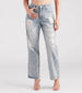 Radiate glitzy iconic vibes in these on-trend rhinestone-adorned straight-leg jeans! They feature a high-rise waist. a glam front rhinestone and ball-chain draped design that continues down the leg. distressed detailing. and a casual straight-leg fit. The cotton-blend denim fabric has a vintage-style color faded effect and offers a rigid fit with no stretch. Complete your look with a cropped bustier and clear mules.
