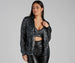 Have a glitzy moment in this sequin shacket for every holiday soiree! Featuring long peasant sleeves. a collared neckline. front pockets. and a snap-button down on a long-length scoop hem. Composed of a knit-lined fabric with minimal stretch. Style with the matching top.