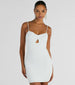 Glimmer with a glitzy shine in this glitter knit mini dress that will bring the glam vibes to your night out! The short dress is shaped with a sleeveless scoop neckline with a trendy twist-front design at the bust. a small keyhole cutout to show a hint of skin. and spaghetti shoulder straps. The bodycon fit on the mini-length silhouette will highlight your stunning curves. Complete the look with rhinestone fringe earrings and metallic heels.