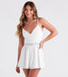 You'll love the breezy effortless vibes of this summer lightweight woven romper! It features a sleeveless V-neckline. spaghetti straps. a fitted high waist with a sheer dainty crochet trim. pleated shorts. and a relaxed fit. The woven fabric includes a knit lining. Style with a layered charm necklace and strappy sandals for casual weekend vibes.