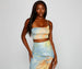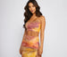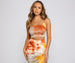 Showcase a golden glow in this tie-dye crop top that is perf for summer! It features a sleeveless one-shoulder neckline. a single spaghetti strap. and a cropped. form-hugging fit. Style this top with the matching maxi skirt and a chic pair of heels.