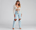 Bring the good vibes to your casual everyday look with these trendy boyfriend jeans! They feature a high-rise waist. a straight leg. major destructed detailing at the knees. and a relaxed fit. The light wash denim fabric offers minimal stretch. Style these jeans with a cute crop top and clear heels.
