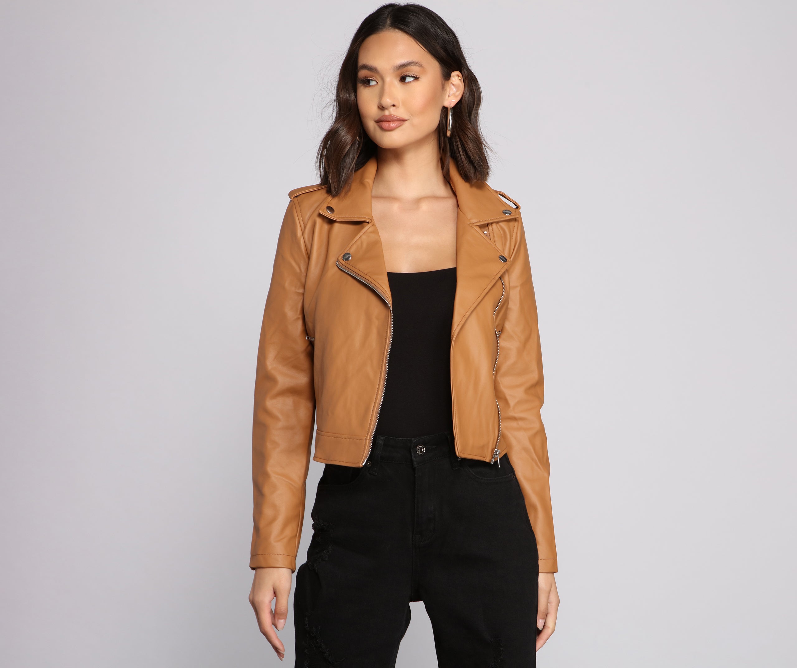 Hey girl! Showcase a gorgeous 'fit by layering on this chic cropped moto jacket. It features a lapel collar neckline with stud detailing. a complete zip front. and a cropped. form-fitting style. Pair this jacket with a basic bodysuit and high rise skinny jeans for that perfect fab fall look.