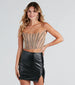 Feel radiant and confident in this gorgeous mesh rhinestone corset top! Featuring a strapless angled neckline. a multi-colored rhinestone embellished striped pattern. and a fitted cropped hem. this top is perfect for a night on the town. The sheer mesh fabric has a front knit lining. Complete the look in a faux leather skirt.