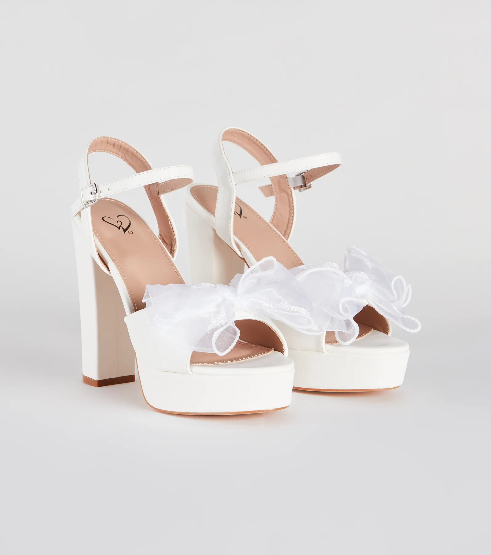 These platform heels will make a gorgeous statement! They feature an almond toe. a wide and curved toe strap with a statement organza bow. a platform sole. a block heel. and an adjustable ankle strap with buckle closure on faux leather material. Perfect for styling with a cocktail dress for a semi-formal occasion!