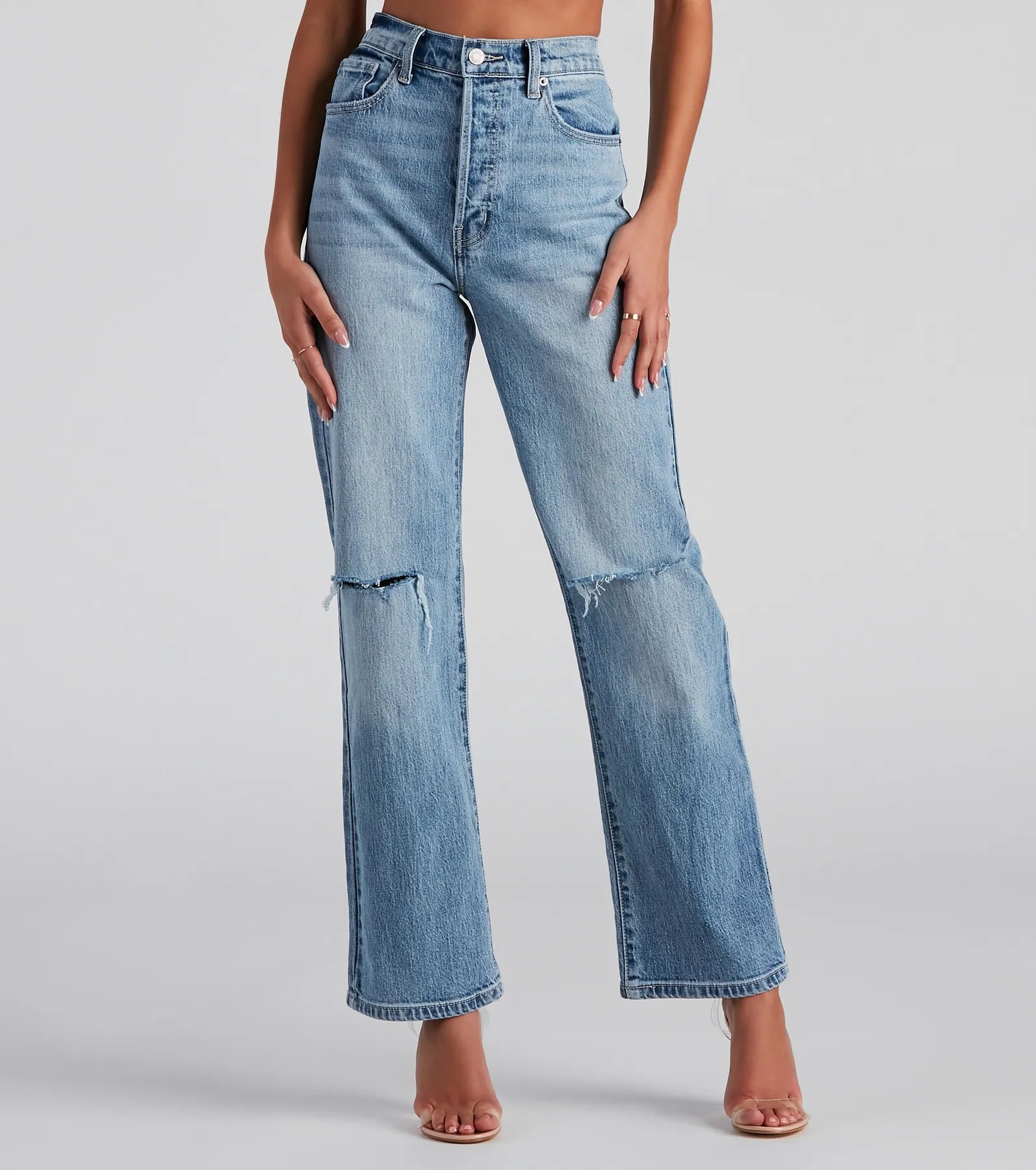 Perk up. these high-rise boyfriend jeans are perfect for slaying every ootd! They feature an ultra-high rise waist. knee slits. a color fade effect. and a boyfriend-style leg-on medium wash denim for a cool vintage look. Complete the look in a corset top.