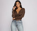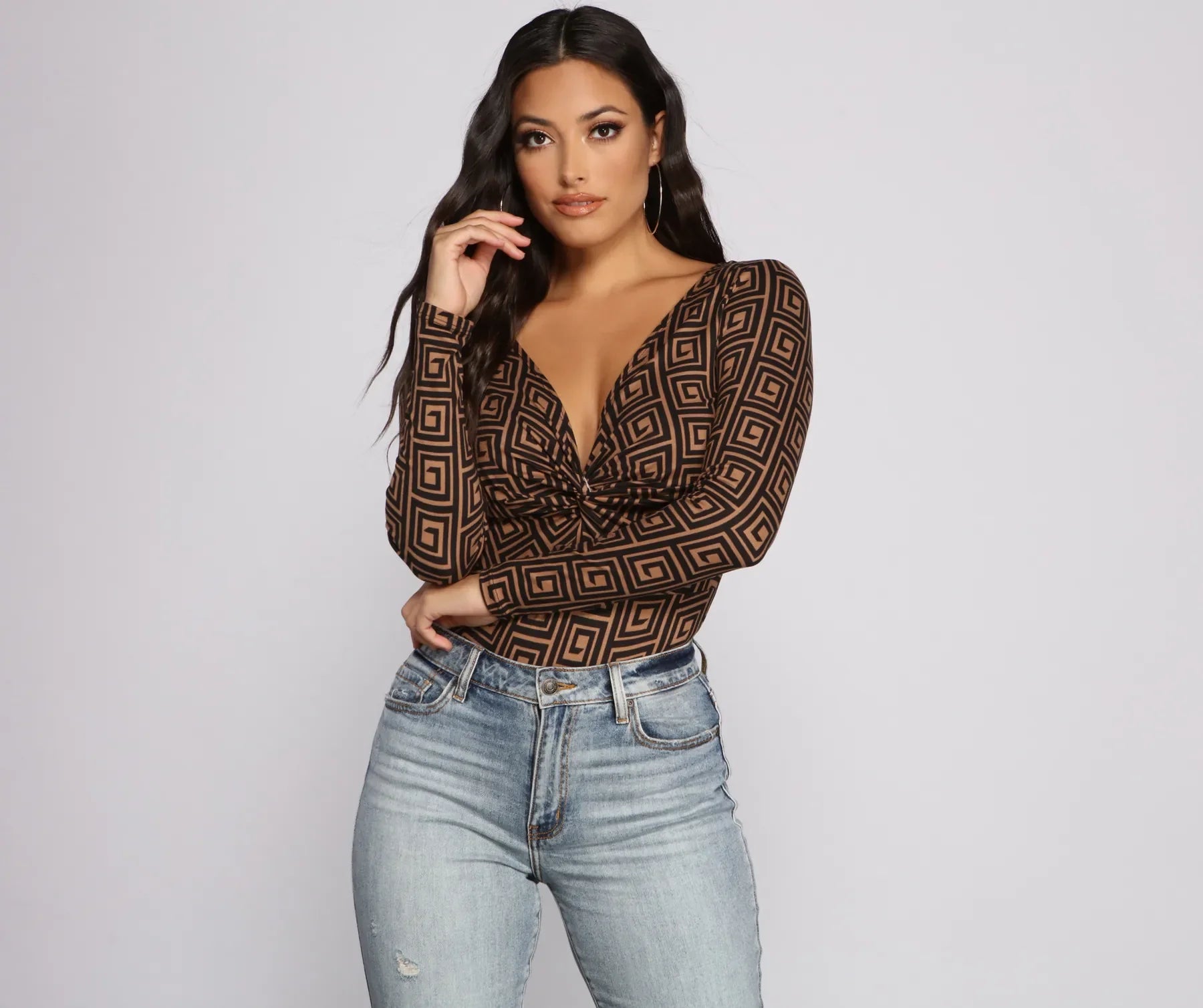 Keep it trendy in a chic print to dress up your bodysuit. The bodysuit features a Greek key print. a plunging V-neckline with a twist knot accent. long sleeves. and a thong bottom with a dual snap button closure. Complete look with a pair of high waist jeans.