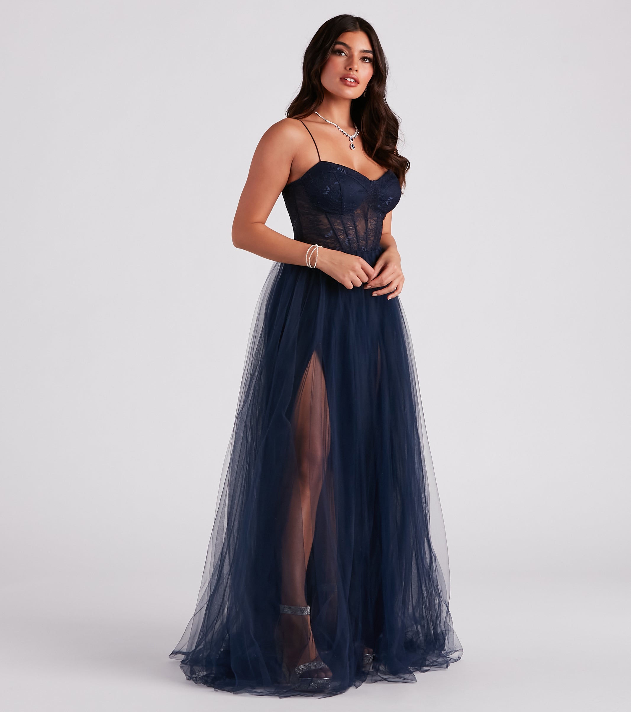 Radiate in a stunning dress that is fit for a queen! Hailey enchants with a sleeveless sweetheart neckline to showcase your rhinestone necklace. molded padded cups that eliminate the need for a bra. and sleek bungee straps. Her bodice features a gorgeous lace design. contrast piping. and flexible boning that offers support. Her slim-fit bodice leads to a flowy floor-length A-line skirt composed of tulle. Her knit lining features a daringly high side slit to create a chic sheer contrast. Complete your formal outfit for a gala or ball with rhinestone heels and a clutch.