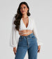 Bring the heat in this gauze woven crop top perf for flaunting some skin! It features peasant long sleeves. a surplice V-neckline. and a wrap-tie design. Complete the look in a denim skirt and heels.