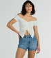 Is it hot in here or is it just you in this flirty off-the-shoulder crop top? Perfect for warmer days. this top features short-sleeve cuffs. an adjustable drawstring bust with a center slit accent to bare more skin! Complete the look in denim jeans and a choker for casual plans.