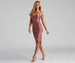 Look chic for the holidays in this sultry midi dress for every soiree! It features a sleeveless. cowl neckline. and spaghetti straps that shape the sultry open back with criss-cross detail. The form-fitting silhouette highlights your curves in a wrap-style midi skirt. Composed of a sleek knit fabric with a moderate stretch. Perfect for styling with lace-up heels.