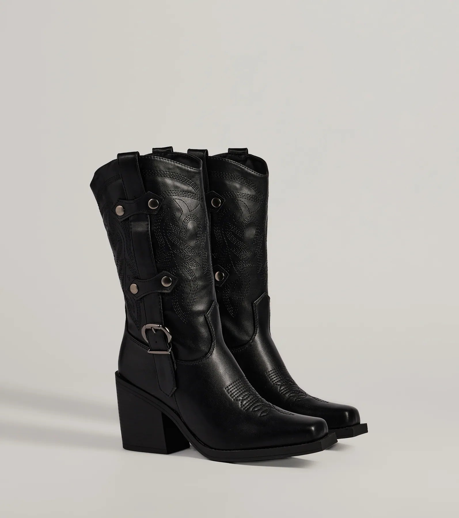 These chic faux leather boots bring the wild west to your wardrobe. With a square toe and buckle strap. they're perfect for strutting your stuff in style.