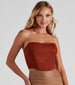 Flaunt your fab self for your honey in this faux suede bustier featuring a strapless bodice with non-slip grip lining. flexible boning inserts. a cropped hem. and a back zipper closure. Complete the look in a sleek mini skirt and basic heels.