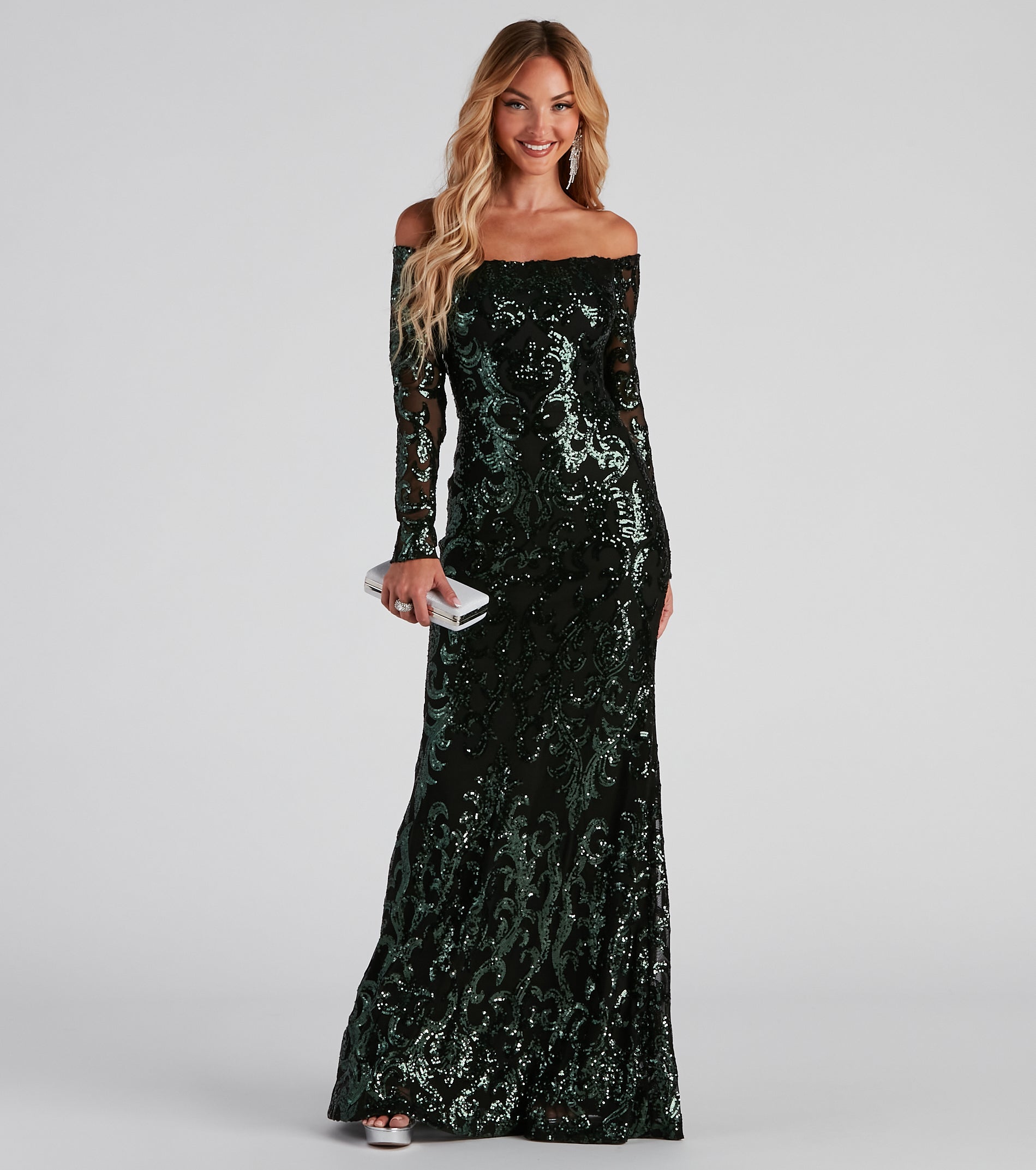 Bring the sparkle with a formal dress that shimmers with each stylish step of your evening! Isador features an off-the-shoulder neckline. elegant long sleeves. and a damask sequin pattern. Her slim-fit waist leads to a flared A-line silhouette to create a twirl-worthy moment! Isador is composed of a lined mesh fabric that offers a form hugging fit with a minimal stretch. Complete look with rhinestone heels and a rhinestone clutch.Â