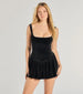 Elevate your style game with this velvet drop waist bubble hem romper. This romper features a chic square neck. V-shaped drop waist. and playful pleated bubble hem.
