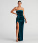 Your evening awaits in the Janet formal dress! She features a strapless. square neckline that shapes the empire waist and fitted bodice. The side ruching creates the illusion of curves while the high front slit displays a sexy show of leg. Her luxe velvet-lined fabric offers a minimal stretch. Add a sparkly clutch to complete your look.Â