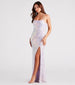 Captivating swirls of sequins give the Jayleen formal dress endless sparkle! It's your time to shine at school dances. banquets. and weddings. She features a sleeveless square neckline. halter spaghetti straps with button closure. a lace-up open back with tie closure. and a flattering A-line silhouette designed with a skin-baring high front slit along her floor-length hem. The formal long dress is composed of a sequin-embroidered mesh fabric with a stunning iridescent hue and includes a knit lining. Finish the look with a glam necklace and earrings set.