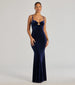 The long velvet dress features a sleeveless sweetheart neckline with an underbust cutout. a corset-like bodice with molded cups. adjustable spaghetti straps. criss-cross straps leading to a lace-up back design. and a mermaid silhouette. Complete the formal outfit with a rhinestone clutch.