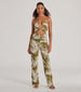 This alluring tropical knit jumpsuit will have you ready to jet-set to paradise! The stretchy knit fabric showcases a contrasting tropical palm leaf print for a dreamy vacay vibe. The jumpsuit is shaped with a sleeveless strappy halter neckline with a cross-front cutout design and a sultry waist cutout. The halter straps lead to an open strappy lattice back design with a tie closure to find your perfect fit. Front ruching at the waist offers a flattering look. leading to a relaxed wide-leg silhouette. Complete your look with espadrille sandals.
