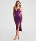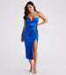 Sassy and sleek. the Joelle satin midi dress is perf for styling up for your next cocktail party. She features a sleeveless plunging V-wired neckline that provides structure. spaghetti straps. ruching at the bodice and down the front. a midi-length. curve-hugging silhouette. and a high side slit. The smooth satin-knit fabric offers a moderate stretch. Complete the look with strappy heels.