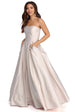 Shine like the rare gem you are in our one of a kind Josephine dress! She features an all over beige hue. a sleeveless bodice. a sweetheart neckline with a silicone no-slip strip. padded cups. built in boning and princess seams. Her slim fit bodice leads to a voluminous ball gown silhouette with hidden side pockets adorned with sparkling gemstone details. She is composed of a textured satin-like fabric that offers a form hugging fit with minimal stretch. Dress is lined and includes a back zipper closure and petticoat.