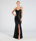 The Joyce glitter formal dress is the season's style for school dances or fancy soirees! Cut from a shimmering glitter woven fabric. this floor-length dress features a pretty open back design with a tie closure. a wrap bodycon silhouette that creates the illusion of an hourglass figure. and a high front slit for effortless movement. Pair with heels.