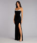 Sophistication meets sparkle in the Juliette formal dress. Designed in plush velvet that contours every curve. this strapless gown features a rhinestone-trimmed sweetheart neckline and corset bodice for sculpted allure. Finished with elegant pleating and a thigh-high slit. it's made for the kind of night that calls for full-glam confidence.
