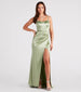 Put your curves on display in the stunning Kacey formal satin dress that makes a gorgeous option for bridesmaids. wedding guests. or school dances! She features a sleeveless square neckline. adjustable spaghetti straps. a corset bodice with flexible boning for a structured look. a padded bust. and a hip pleated side seam that creates the asymmetrical wrap mermaid skirt with a sultry slit along her floor-length hem. The formal dress is composed of silky satin-lined fabric with moderate stretch. Complete the look with earrings and a clutch.