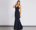 You'll know how to make an entrance in our gorgeous Karina formal dress. She features a sleeveless bodice. tank-like shoulder straps that lead to a detailed strappy back. a V neckline with a dual rhinestone trim accent. padded cups. a high waist seam. and a fitted mermaid length silhouette with a ruffle detail back. Dress is composed of a crepe fabric. offering a curve hugging fit with moderate stretch.