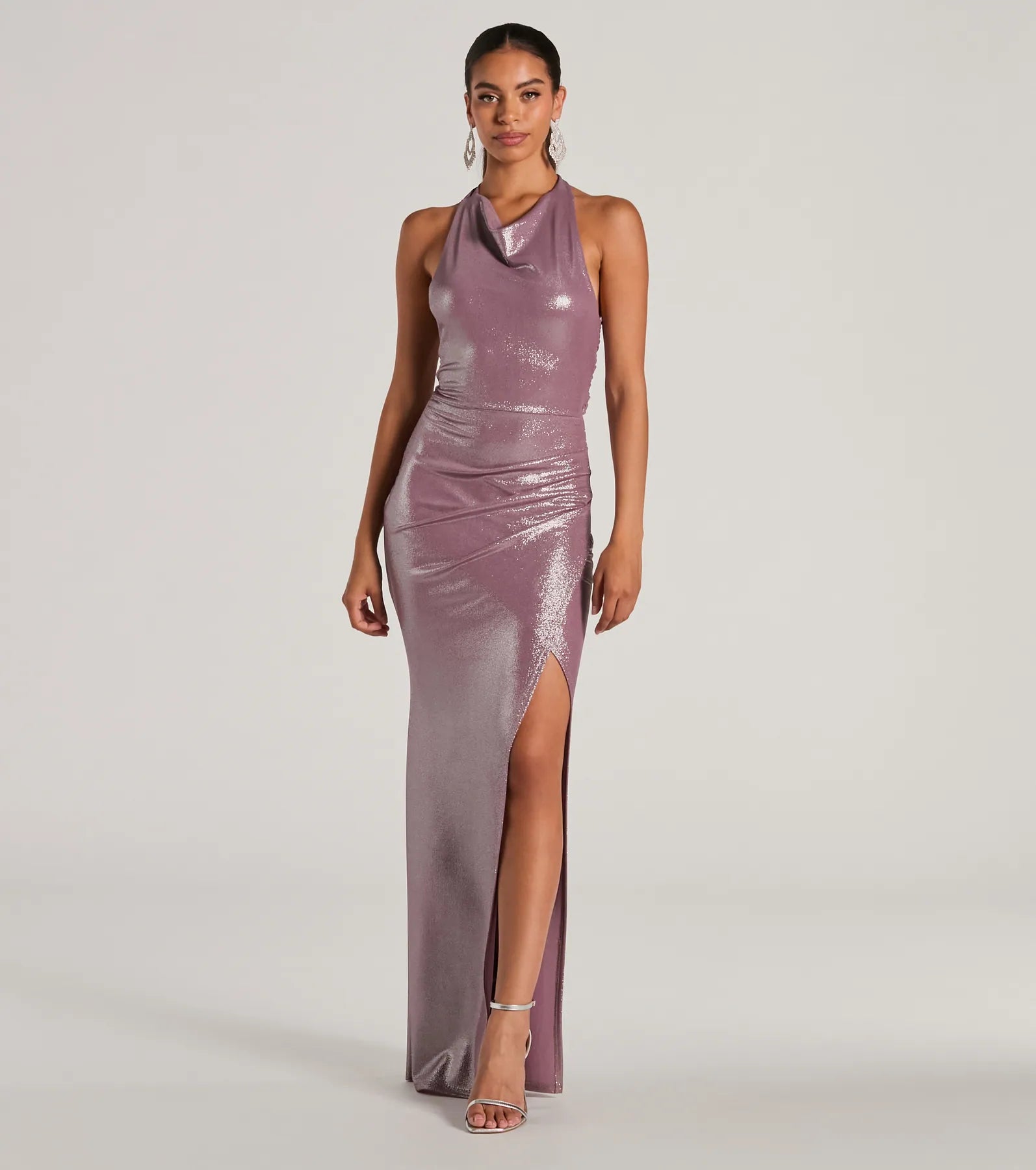 Effortlessly move through the evening in the Kayla mermaid formal dress in elegant fashion at black tie galas or weddings! She boasts a halter cowl neckline with a tie. a striking open back with ruched strap detail. and a figure-flattering mermaid silhouette. Finished with a high front wrap slit. and floor-length hem. on shimmery foil knit fabric. this dress is perfect for making a sophisticated statement at any formal event. Complete the look with earrings. a clutch. and heels.