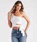 Keep it cute and one-sided in this must-have crop top! It features a sleeveless one-shoulder neckline. a tank strap. and a flirty tie-waist design on stretchy rib-knit fabric. Complete the look in high-rise denim shorts for a beach day!