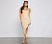 Keep it basic with a midi dress that can be dressed up for your next date night! The dress features a sleeveless square neckline. tank-shoulder straps. a ruched high side slit with a drawstring and a midi length silhouette. The dress is composed of a ribbed knit fabric that offers a form hugging fit with a moderate stretch. Complete look with mules and hoops.