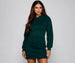 Keep it casual in a mini dress that is part cozy and part glam. The hoodie mini dress features a corset bodice with piping detail. long sleeves. a hoodie. and a mini length silhouette. The mini dress is composed of a knit fabric that offers a form hugging fit. Complete look with chunky sneakers.Â