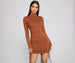 Keep it real in this dress that keeps it chic! The dress features a mock neck. long sleeves. ruched side seams. and a mini length silhouette. The dress is composed of knit fabric that offers a form hugging fit with a moderate stretch. Complete look with sleek mules.