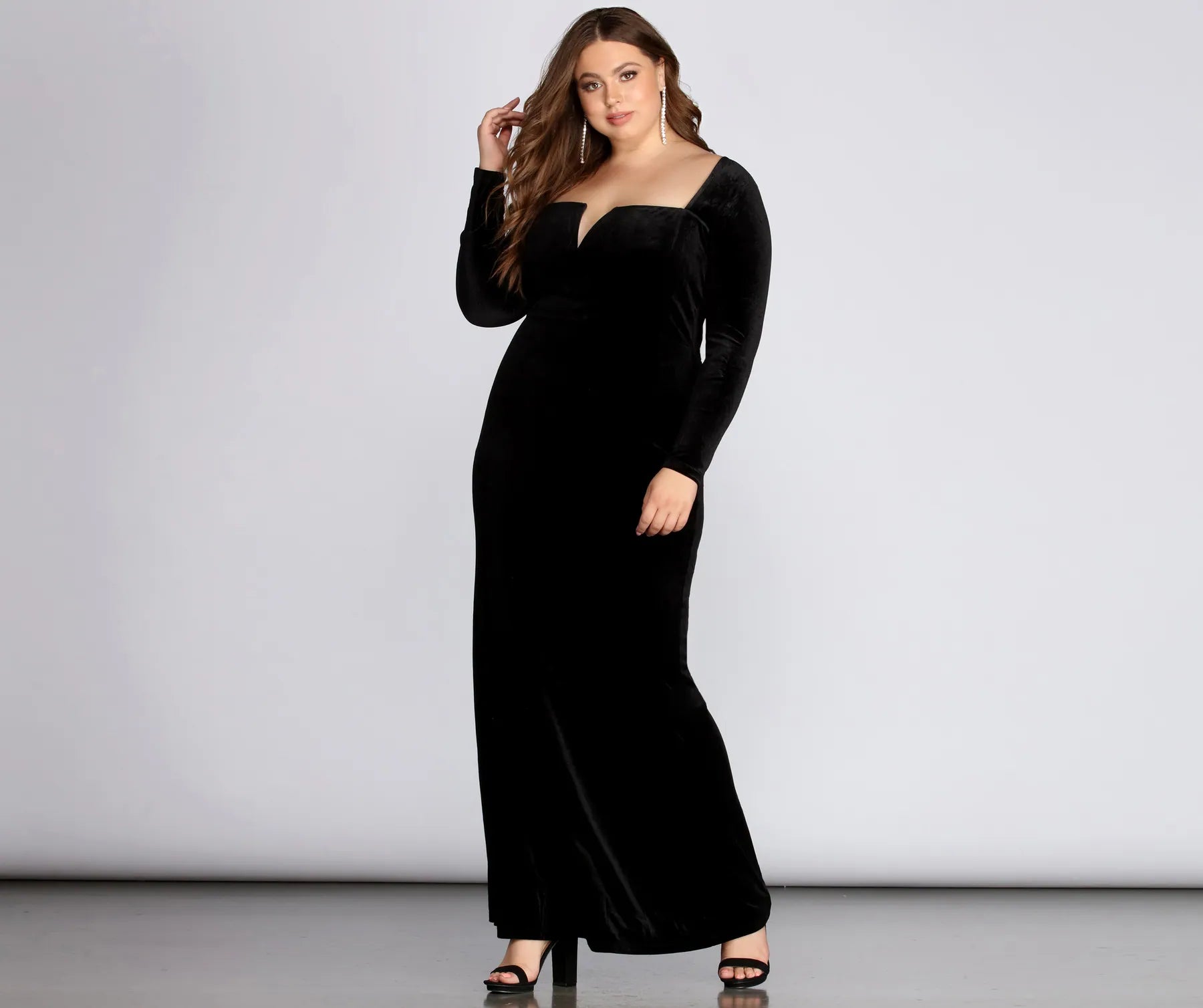 Make it a velvet affair in our luxe Kelly dress! She features a plunging wired V-neckline. long sleeves and a slim fit bodice that leads to a curve hugging floor length silhouette. Dress is composed of a lined velvet fabric that offers a moderate stretch for a comfortable wear. Includes a back zipper closure with hook and eye closure.