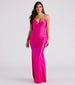 Entice them all with your stunning allure in the sleek Keyla satin formal dress. She features a sleeveless V-neckline with a surplice design. spaghetti straps. a stylish wrap silhouette at the waist with ruched detailing. a hip-hugging fit. and a floor-sweeping A-line silhouette. Complete your look with rhinestone statement earrings.