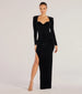 Make a regal impression in a long dress that features a luxe velvet fabrication. a structured sweetheart neckline. fitted long sleeves. a bold high side slit. and a mermaid silhouette. Complete look with a rhinestone clutch for the perfect wedding guest outfit.