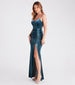A timelessly glamorous style for bridesmaids or wedding guests. the Kierra Formal Glitter Velvet High Slit Dress brings sophistication and elegance. She features a sleeveless sweetheart neckline with a wired insert. bungee spaghetti straps. a padded bust. and a back cutout with a hook-clasp closure. Her front ruched seam and high front slit provide an alluring texture. while the long-length hem and A-line silhouette promise a flattering fit. Glittering velvet knit fabric offers the perfect sparkling touch and has a bust lining and moderate stretch. Complete the look in a necklace and earrings set.