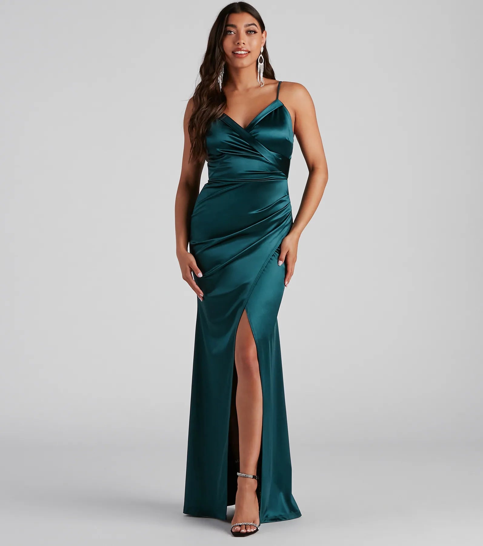 Wrap yourself in elegance tonight when you slip into a luxe gown! She is designed with a v neckline. adjustable spaghetti straps. padded cups. and a fold-over trim. Her bodice leads to a high waistline that gathers at one side and the start of a long skirt that wraps over. Her skirt leads to a floor-sweeping length and features a high slit at the center. She is lined at the bust and has a zipper closure at the back with a hook and eye closure that keeps her in place all night! Complete your formal outfit with a satin clutch.