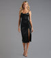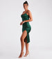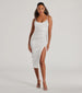 Trend right and look timeless in the body-skimming Kristen formal satin midi dress at cocktail parties. graduations. and dressy birthdays! She features a sleeveless cowl neckline. spaghetti straps. a front ruched seam that accentuates your curves. a bodycon silhouette. and a sultry slit along her hem. The formal dress is composed of a luxurious silky satin-lined fabric with minimal stretch. Complete the look in rhinestone strappy heels.
