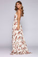 Make a captivating entrance in florals! Krystal enchants the room with her sleeveless bodice. square neckline and bold open back with a lattice back. Her slim fit bodice leads to a sweeping floor length      A Line silhouette. Her all over floral print features pink and mauve hues that complement the ivory background.