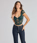 Romance your every day in this lace bustier featuring delicate cap sleeves and a flirty sheer bodice with a cropped hem. Complete the look with a satin skirt.