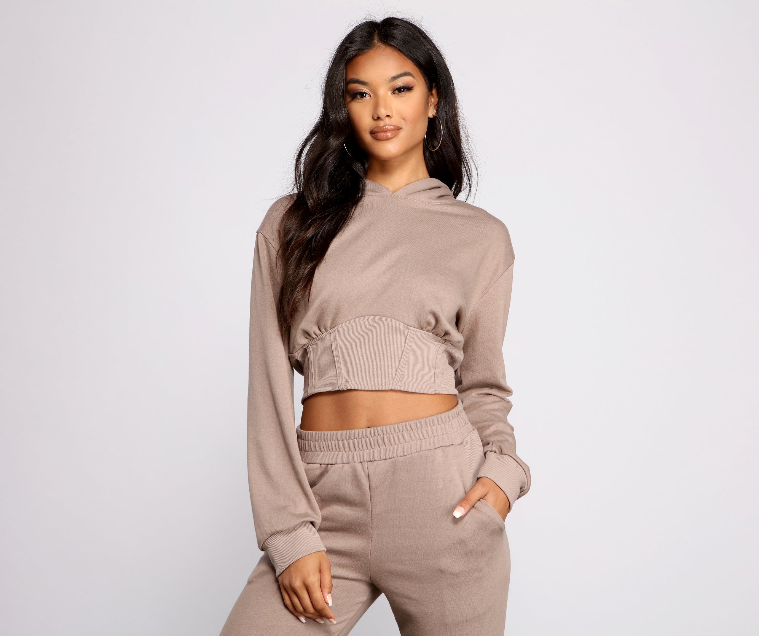 You'll be lookin' like a laidback cutie in this adorable french terry hoodie! It features a cropped hem with a corset design to add a trendy feel. Pair with the matching joggers and some chunky sneakers for the perf loungewear look.